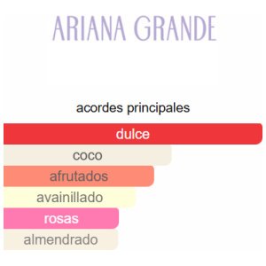EAU DE PARFUMValorado con 0 de 5$280,000Sweet Like Candy de Ariana Grande es una fragancia de la familia olfativa Floral Frutal Gourmand para Mujeres. Sweet Like Candy se lanzó en 2016. Las Notas de Salida son zarzamora (frambuesa negra), pera y bergamota; las Notas de Corazón son crema batida, malvavisco (bombón), grosellas negras, frangipani (plumeria, plumaria, atapaima), jazmín y madreselva; las Notas de Fondo son vainilla y madera de cachemira. -