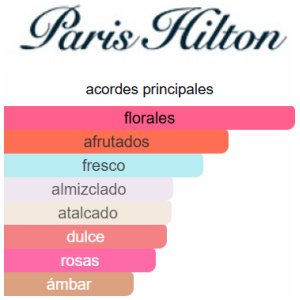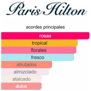 EAU DE PARFUMValorado con 0 de 5$150,000Paris Hilton de Paris Hilton es una fragancia de la familia olfativa Floral Frutal para Mujeres. Paris Hilton se lanzó en 2005. Paris Hilton fue creada por Steve DeMercado y James Krivda. Las Notas de Salida son melón, manzana y durazno (melocotón); las Notas de Corazón son fresia, mimosa, jazmín, lirio de los valles (muguete), azucena y nardos; las Notas de Fondo son almizcle, ylang-ylang, sándalo y musgo de roble. -
