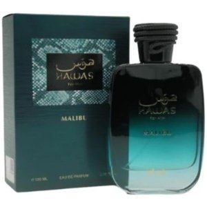EAU DE PARFUMValorado con 0 de 5$340,000Hawas Malibu de Rasasi es una fragancia de la familia olfativa Aromática para Hombres y Mujeres. Esta fragrancia es nueva. Hawas Malibu se lanzó en 2025. Las Notas de Salida son piña, naranja y toronja (pomelo); las Notas de Corazón son ámbar, raíz de lirio y lavanda; las Notas de Fondo son haba tonka, almizcle, pachulí y cachemira. -
